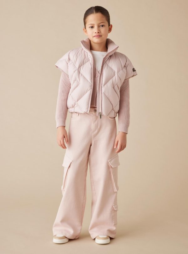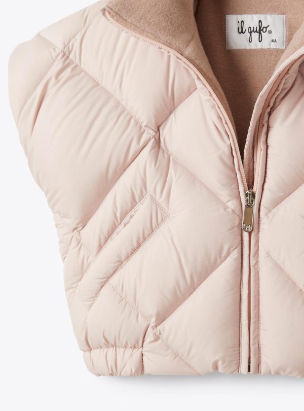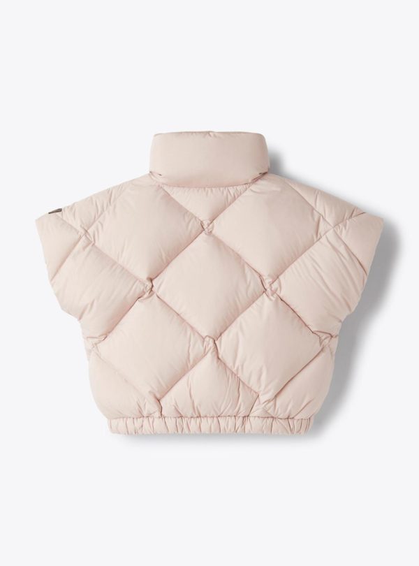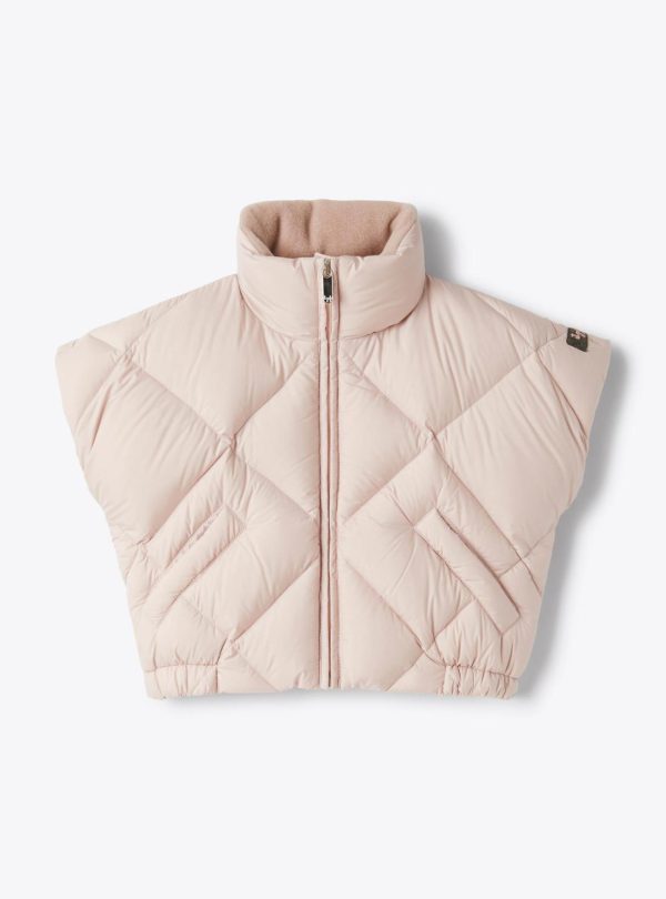Vest made of SUPER MICROFT® microfiber nylon with a boxy design and diamond quilting, fully lined with fleece. Features a full-length front zipper, side welt pockets with snap buttons, and elasticized hem. The padding is composed of 90% down and 10% feathers.