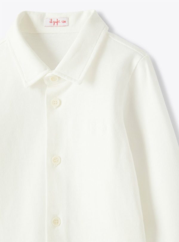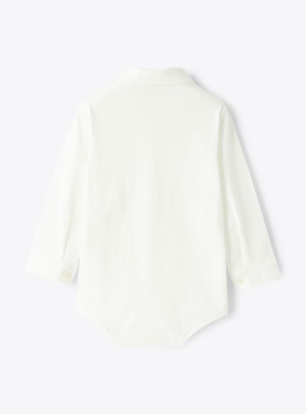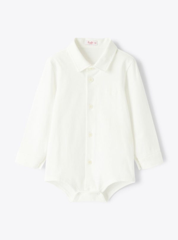 Button-down bodysuit in cotton jersey. Italian collar, front button closure, sleeve buttons, and snap buttons at the bottom opening.