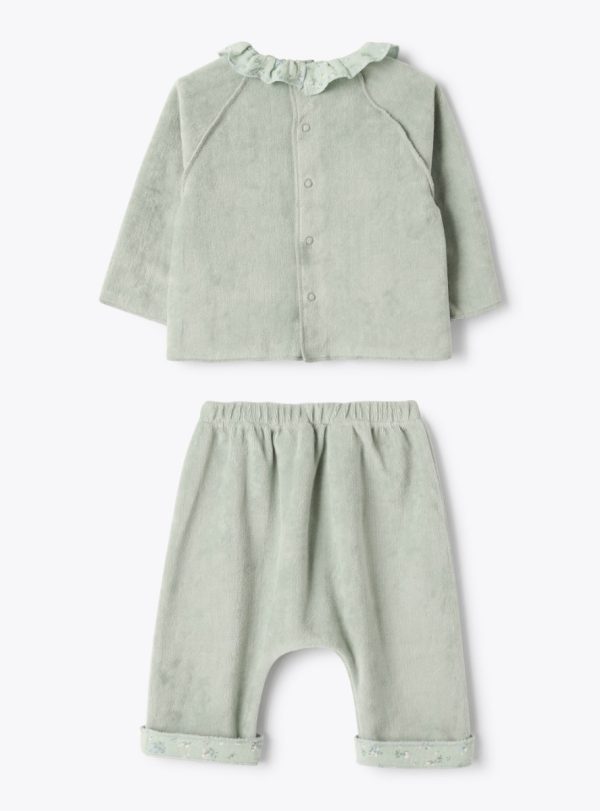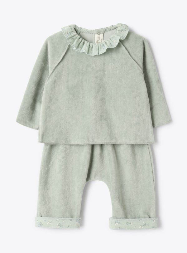 Upcycled chenille set. Long-sleeve T-shirt with ruffled collar in organic cotton gauze, raglan sleeves with overlock stitching, and back opening with snap buttons. Pants with elastic waistband and organic cotton gauze insert at the hem.