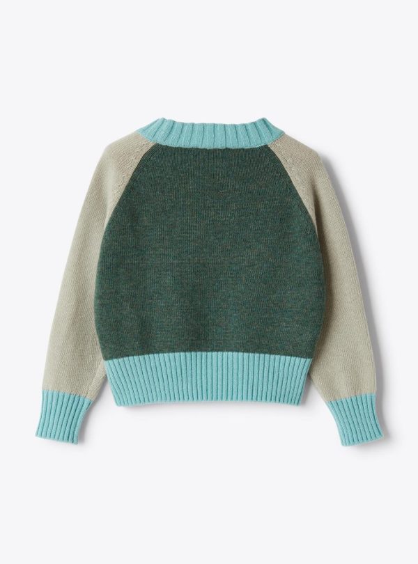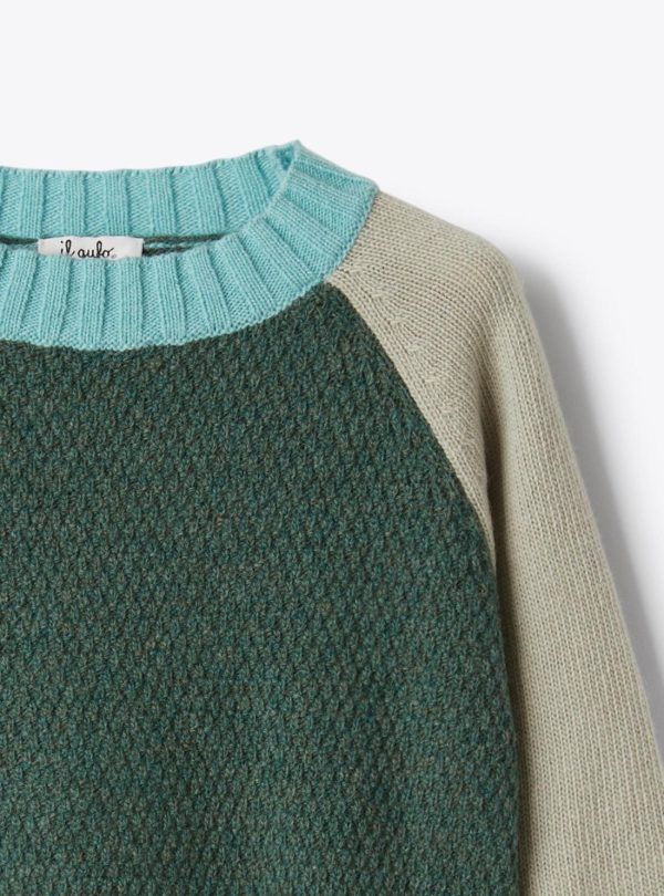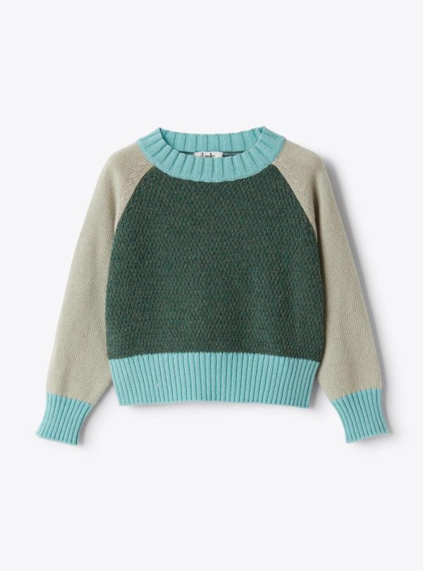 Crew neck sweater with color-block design in extra fine merino wool. Raglan sleeve, front part with rice stitch pattern, and ribbed finishes.