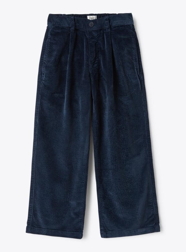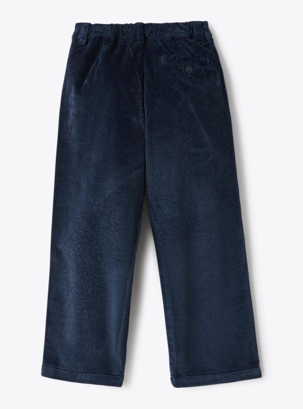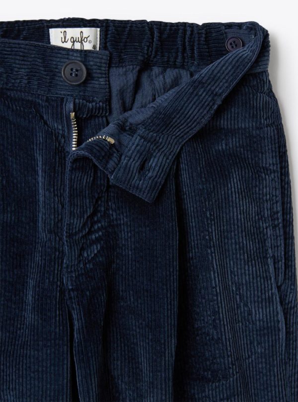 Straight leg trousers in stretch ribbed cotton corduroy. Button and zip closure, side pleats, and slash pockets. Buttoned welt pocket at the back and internal elastic for fit adjustment.