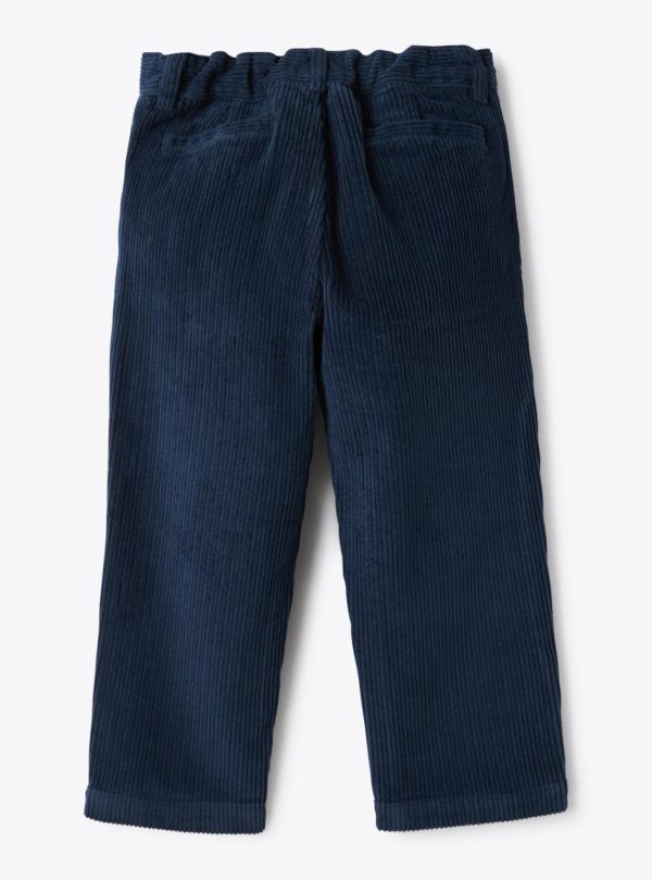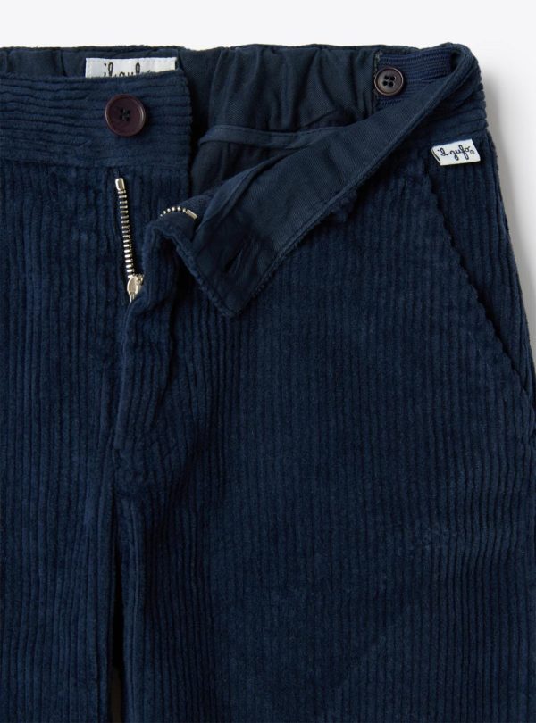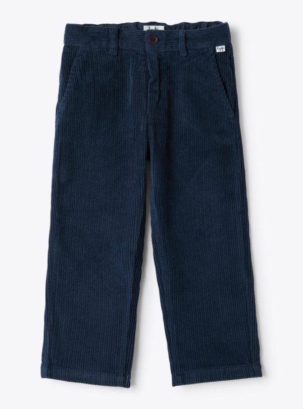 Corduroy trousers in stretch cotton with ribbing, front opening with button and zipper, side slit pockets, and welt pockets at the back. Internal elastic for adjusting the fit.