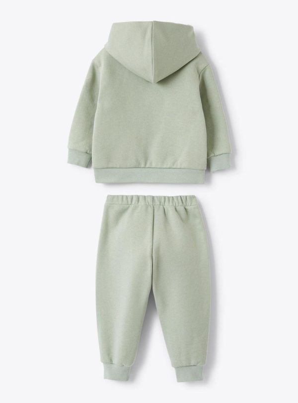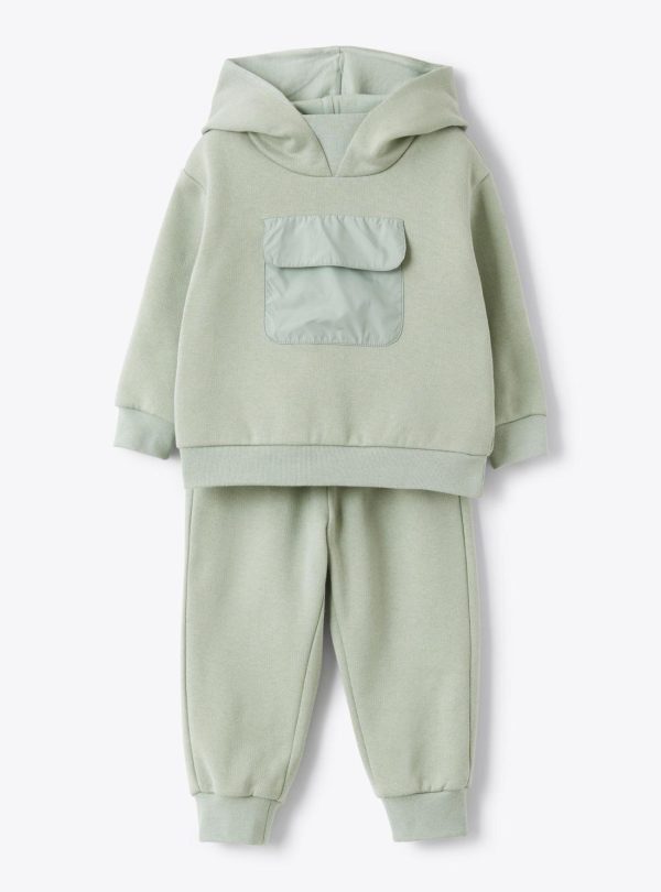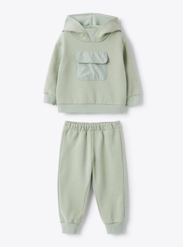 Cotton fleece set. Hoodie with hood and SUPER MICROFT® microfiber nylon applied pocket. Jogger pants with elastic waistband and cuffs at the bottom.
