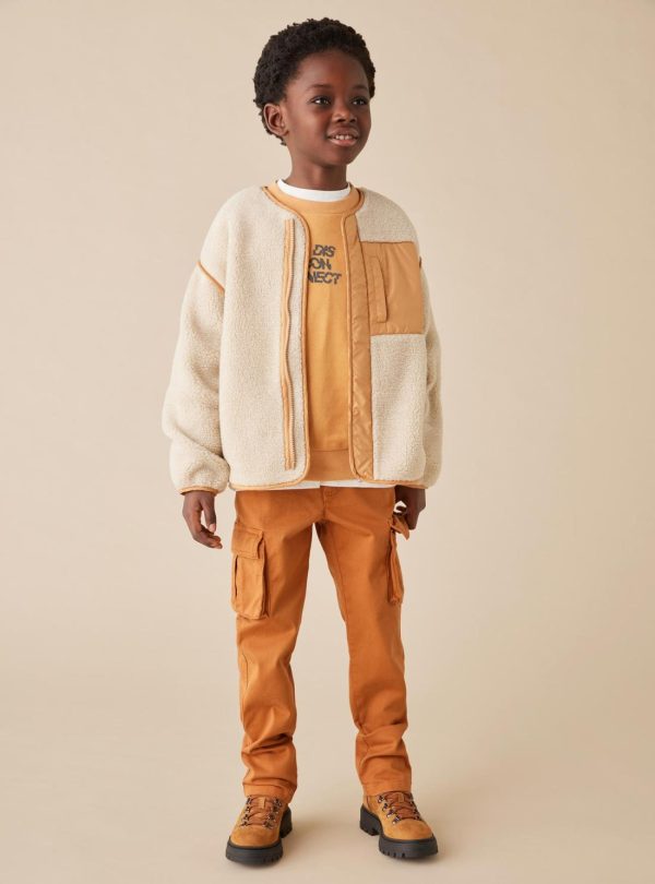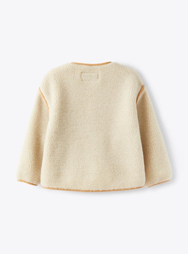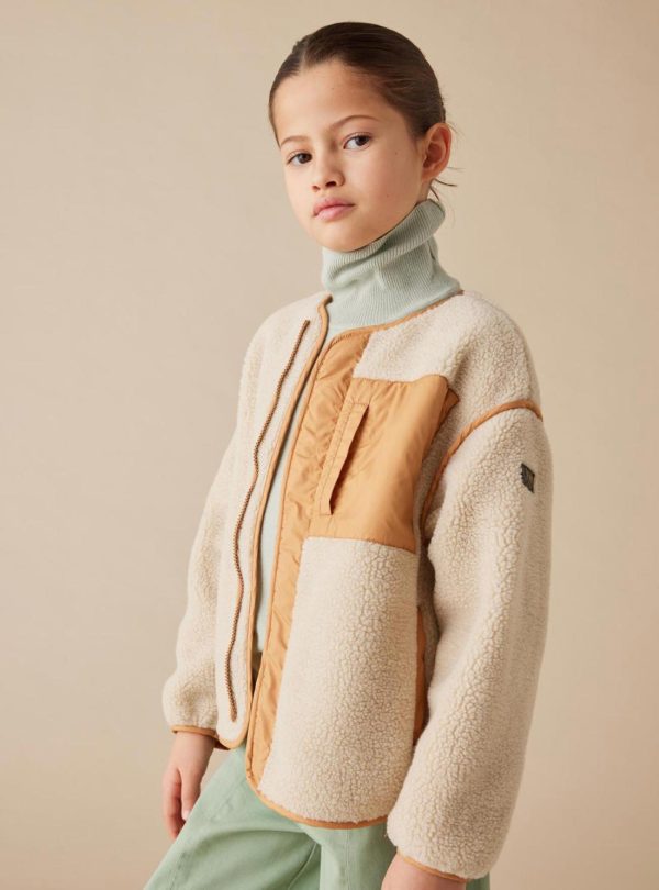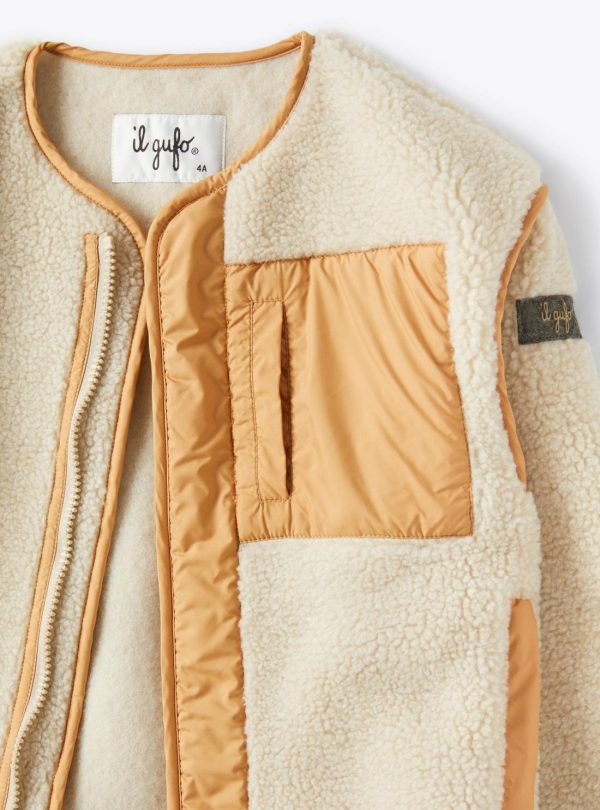 Garment made of curly fleece with a full zip opening. Side applied pocket, welt pockets, and profiles and inserts made of nylon.
