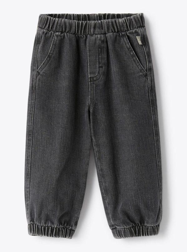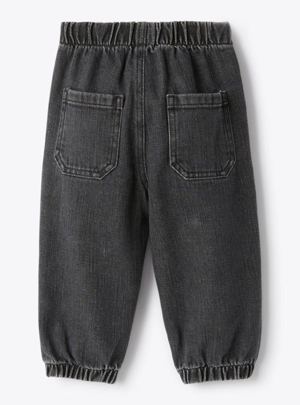 Denim trousers with elastic waistband and faux zipper. Slant pockets, applied pockets at the back, and elasticized cuffs.