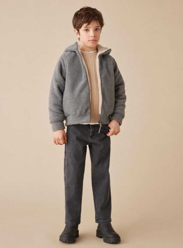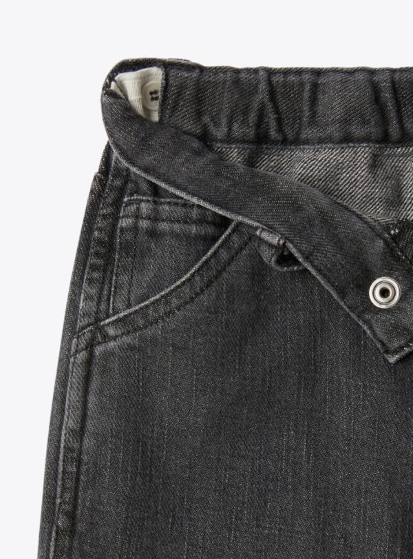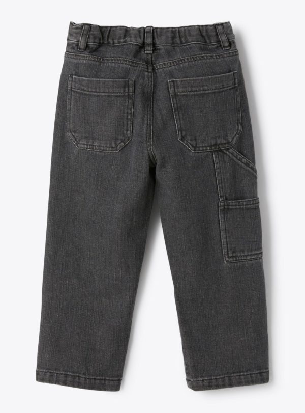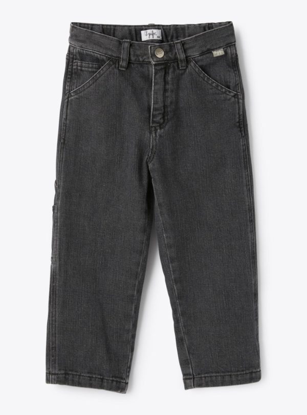 Workwear-style pants in denim with a snap button and zip closure, American pockets, and a coin pocket. Features applied back pockets, a tool pocket, and an internal elastic for adjustable fit.