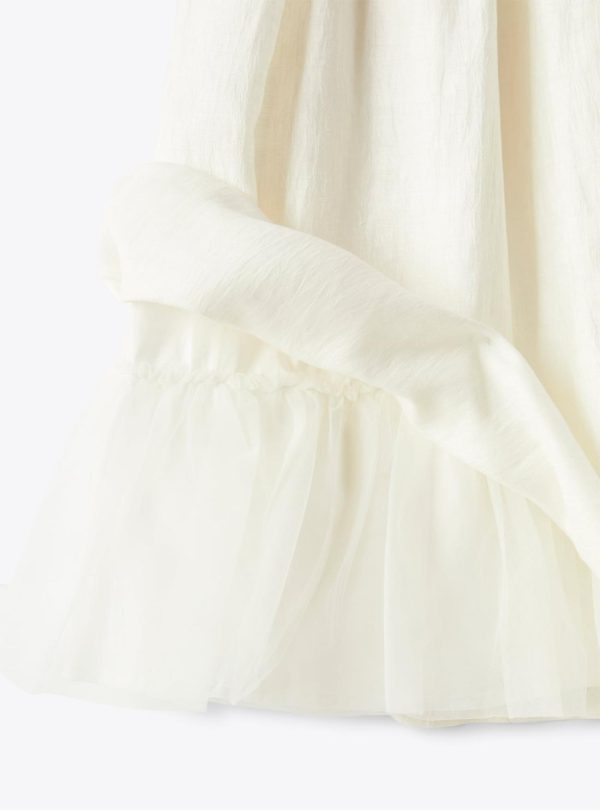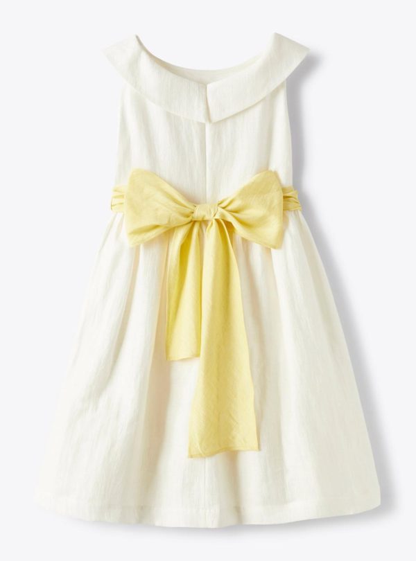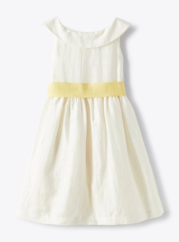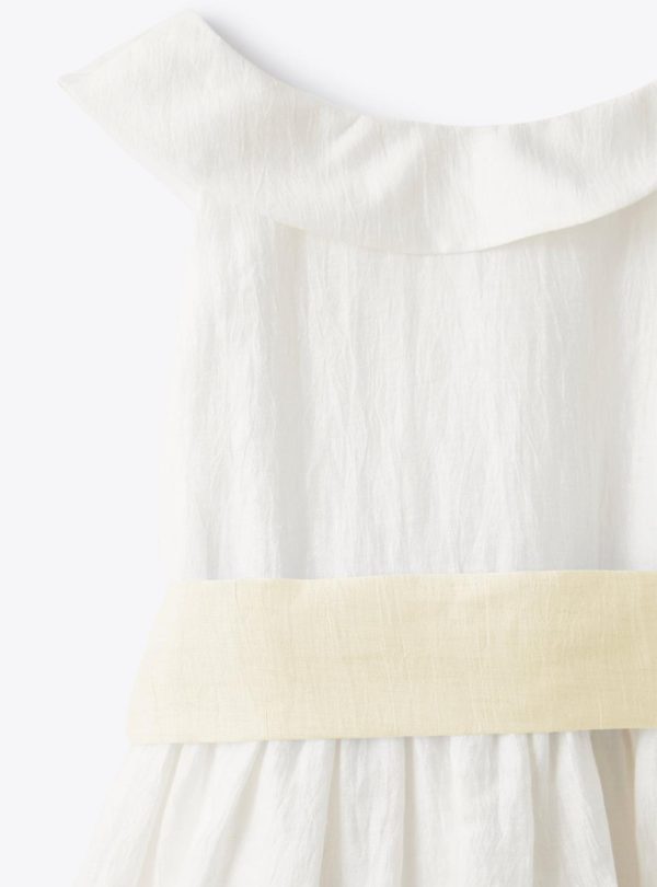 Buttercup model. Short sleeveless dress made from a shantung-linen blend in milk white. Ruffle detail around neckline at the front and back. Waistline completed with side loops and an elegant removable belt in a chick-yellow linen blend to be tied into a pretty bow at the back. Slip made from 100% cotton muslin in white with a tulle flounce at the garment bottom for extra swishiness. Concealed zip fastening at rear. The garment is part of the Il Gufo Atelier capsule collection which epitomises all our artisanal expertise, years of experience and the sheer love and passion we put into our work. The hallmarks of this capsule collection are a sartorial construction, balanced silhouette and curated details.