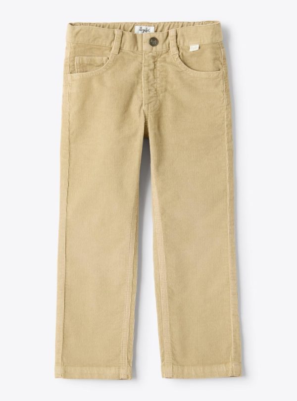 Five-pocket pants made from corduroy fabric with a millerighe pattern, crafted from stretch cotton. The front closure features a button and zipper. It includes side pockets with a coin pocket, patch pockets at the back, and internal elastic for fit adjustment.