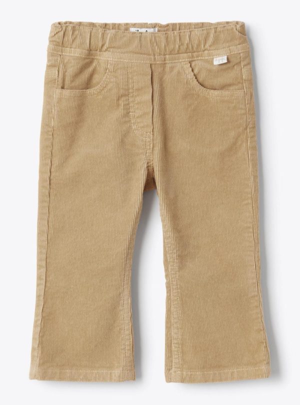 Flared design trousers made from millerighe stretch cotton velvet with an elastic waistband, faux zipper, and side pockets.