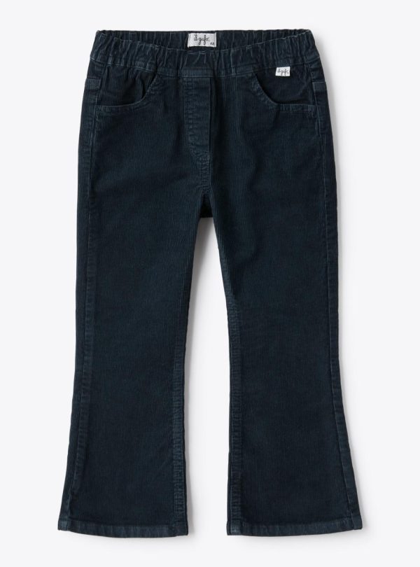 Flared design trousers made from millerighe stretch cotton velvet with an elastic waistband, faux zipper, and side pockets.