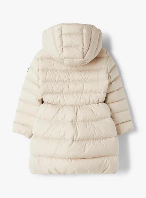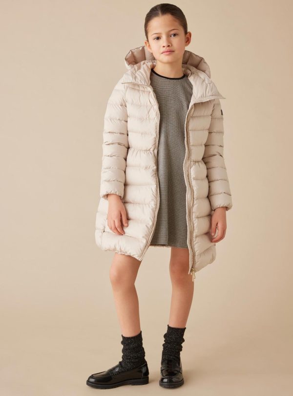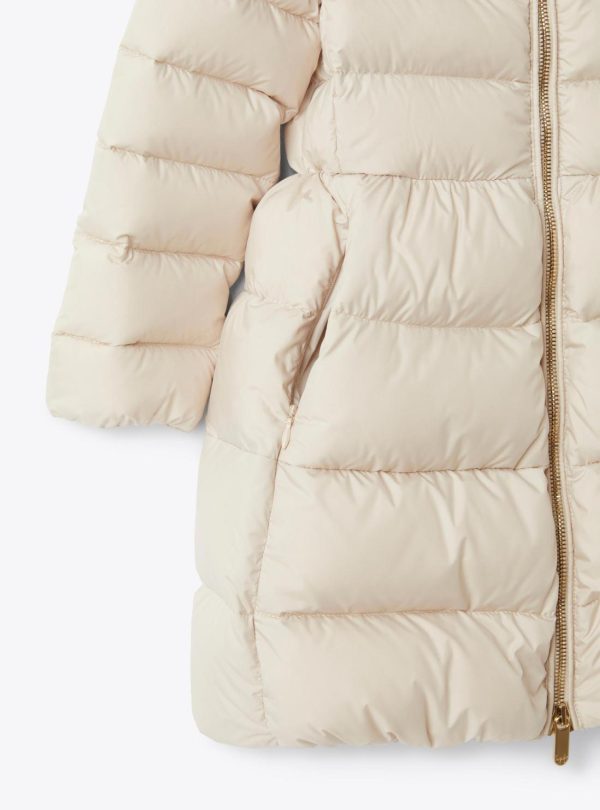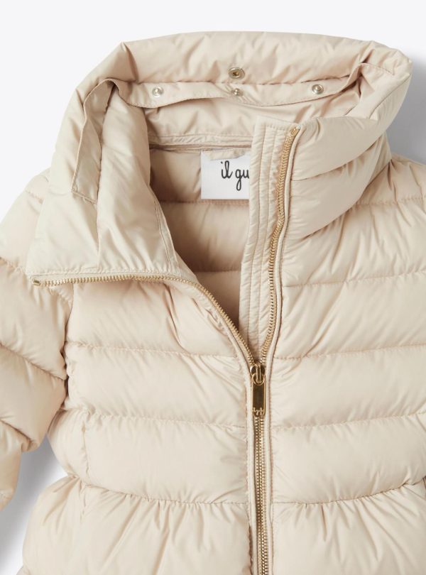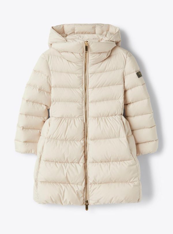 Flared design jacket made of SUPER MICROFT® microfiber nylon with a removable hood, full-length double zipper, internal drawstring, and hidden side pockets. Elasticized cuffs and hem. The filling is composed of 90% down and 10% feathers.