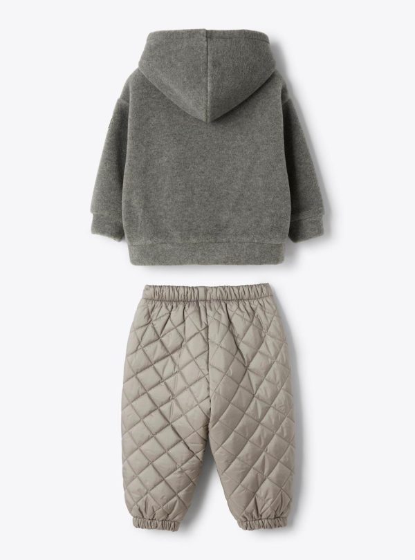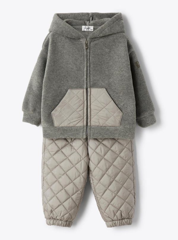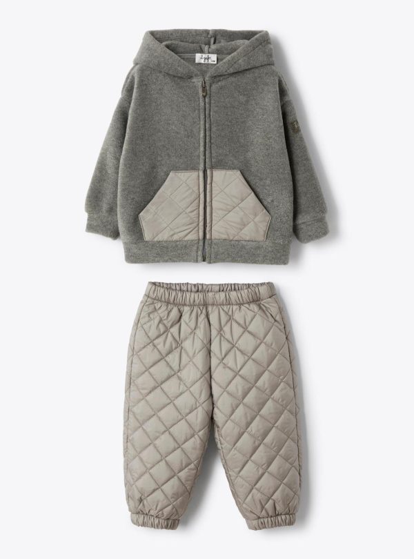 Fleece and nylon set. Hooded jacket with full zip closure and side pockets. Jogger pants with elastic waistband, elasticized cuffs, and cotton jersey lining.