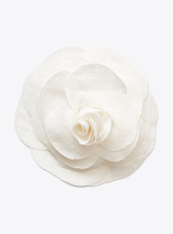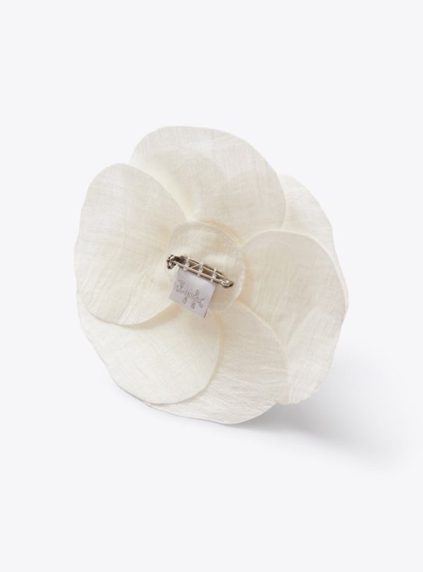 Elegant floral brooch made of a Shantung silk-linen blend featuring a cluster of petals with raw-cut edges. It closes at the back with a rear metal fastening. The accessory is part of the Il Gufo Atelier capsule collection. The hallmarks of this capsule collection are a sartorial construction, balanced silhouette and curated details.