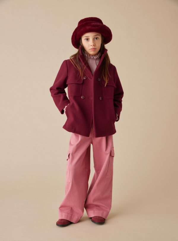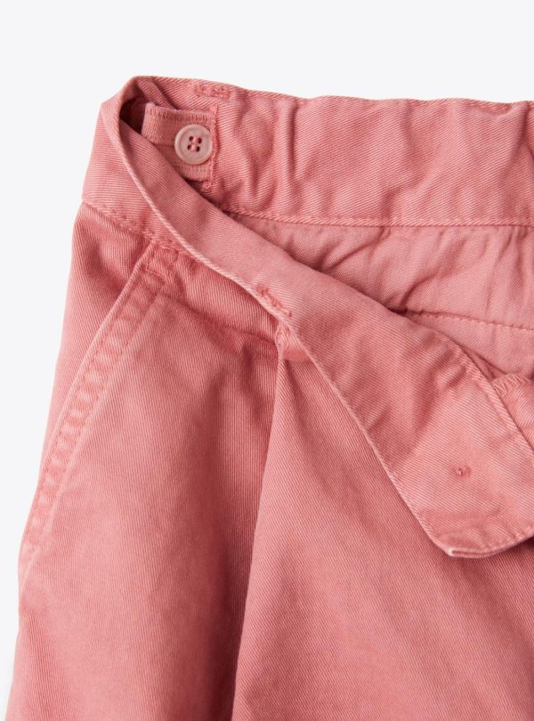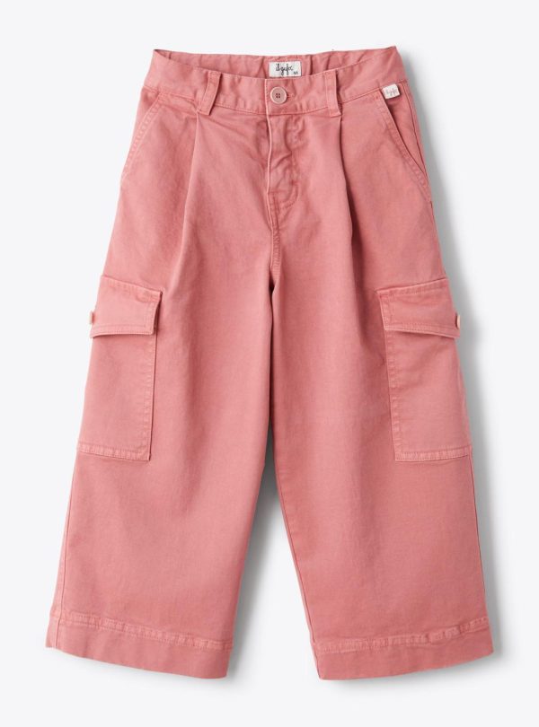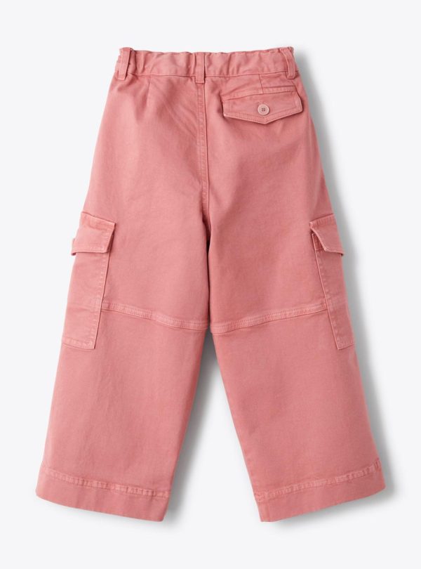 Loose fit cargo pants made of stretch cotton gabardine with a button closure, front pockets, gusset pockets, and a back button pocket. Features an internal elastic for adjustable fit.
