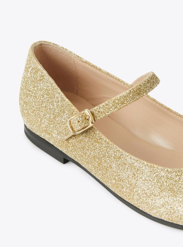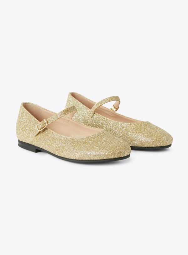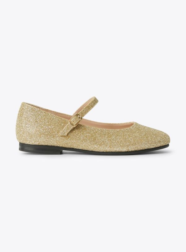 Ballet flats covered in glitter all over, adjustable strap with buckle, and anti-slip rubber sole. Lined with leather.
