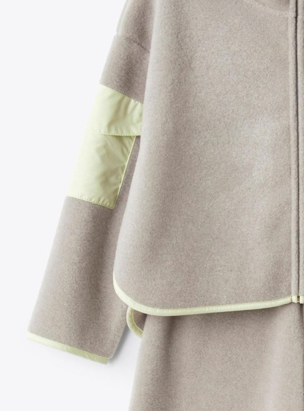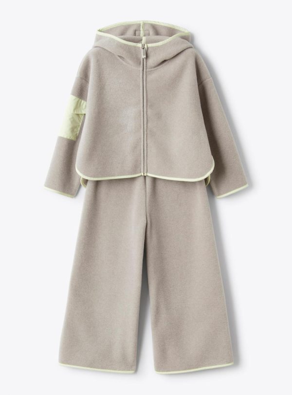 Two-piece fleece set with nylon inserts. Hoodie with full front zip, hood, and patch pocket. Wide leg pants with elastic waistband.