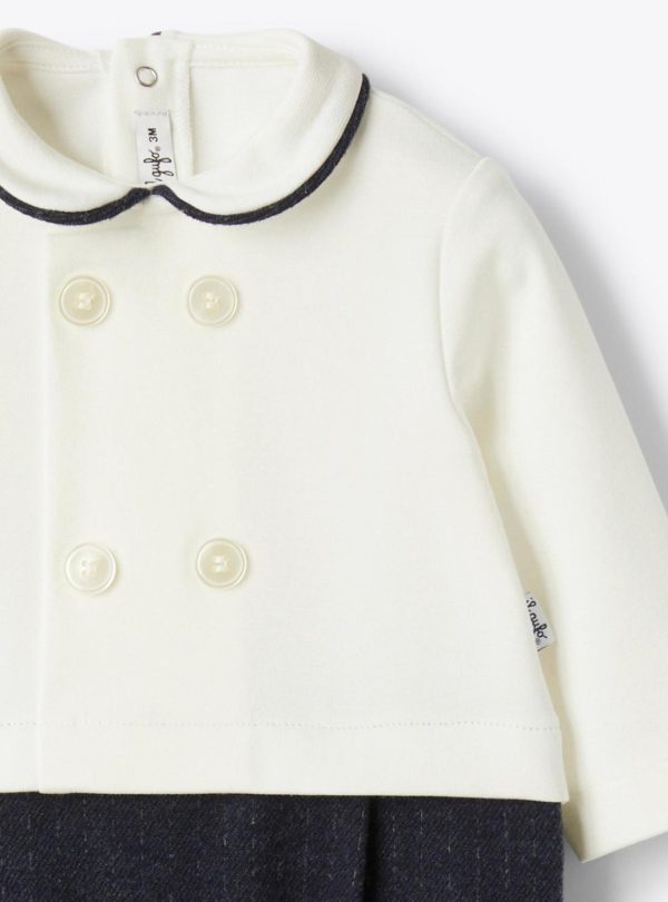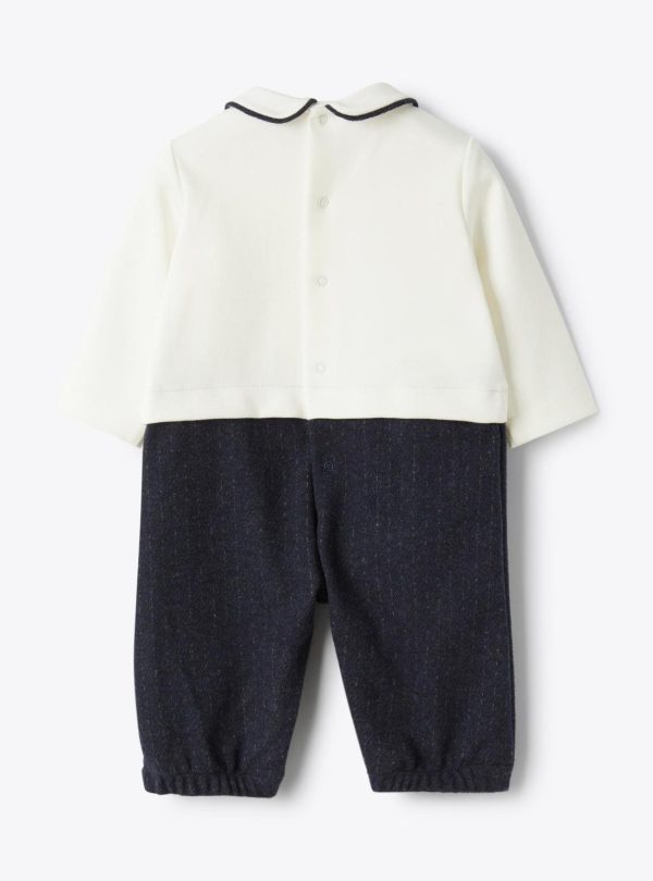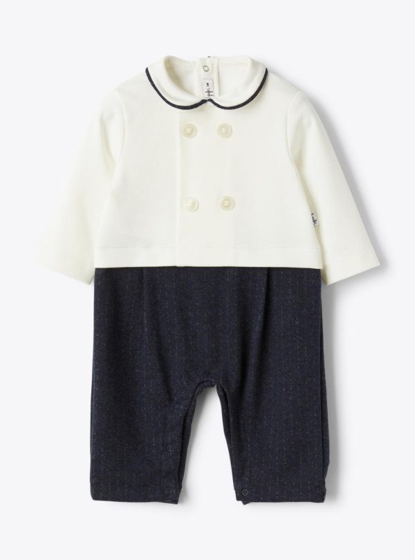 Jumpsuit in Milano knit and herringbone fleece with rounded collar, faux double-breasted opening, and closure with snap buttons at the bottom and back. Elasticized bottom at the back.