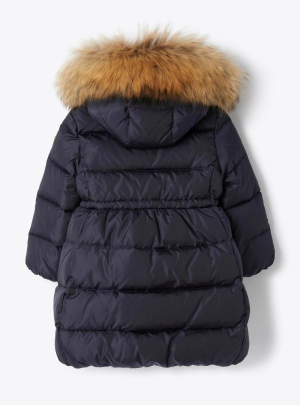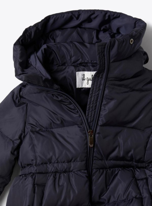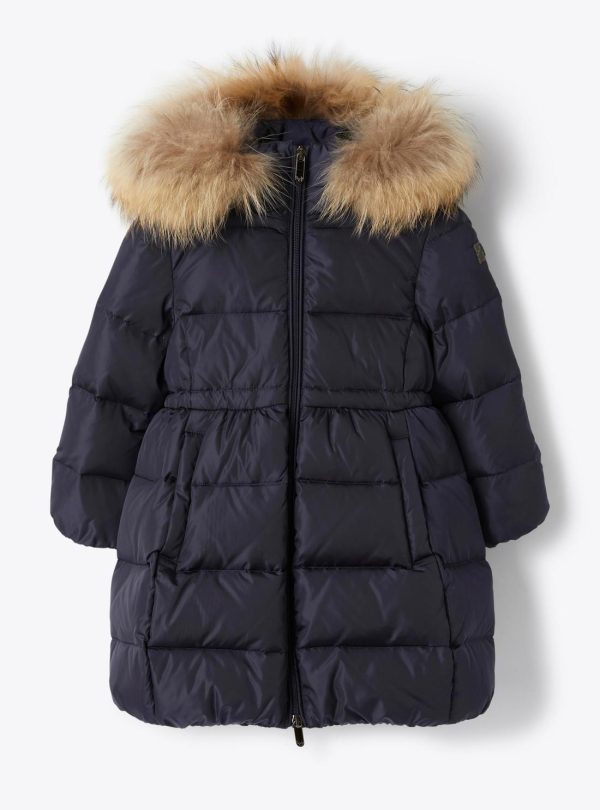 Flared design taffeta jacket with full-length double zipper, welt pockets with snap button, and hood with removable insert. Double internal drawstring to adjust the fit, elasticized cuffs and hem. The filling is made up of 90% down and 10% feathers.