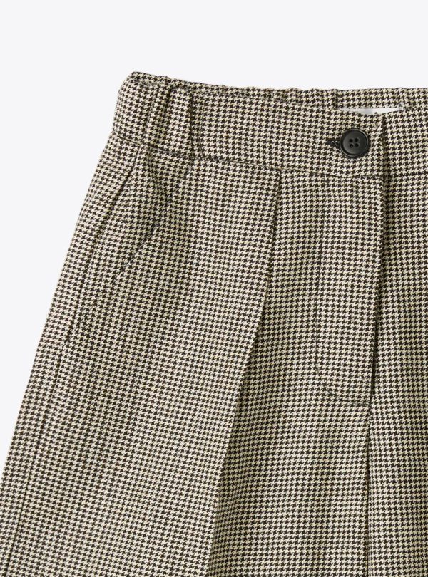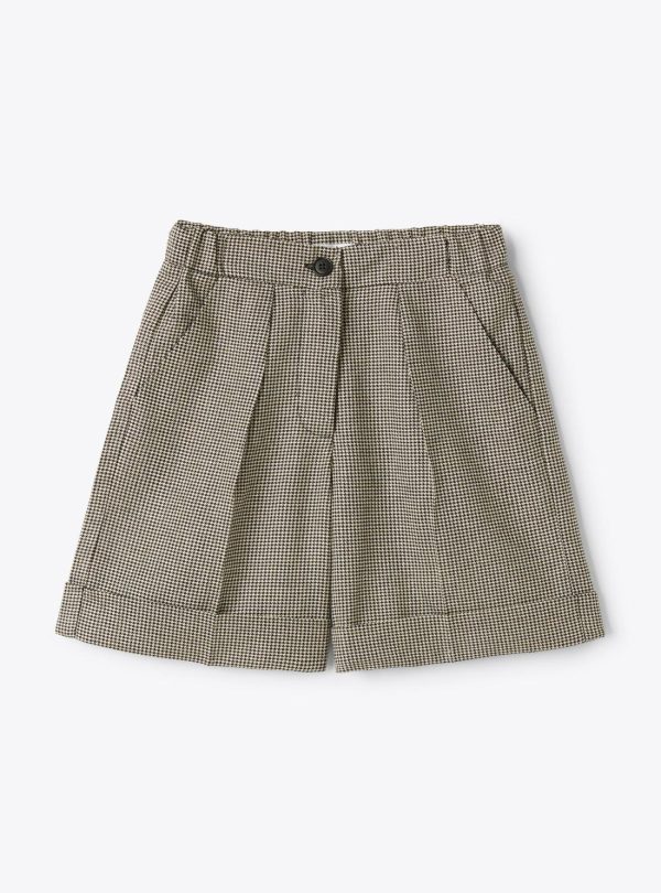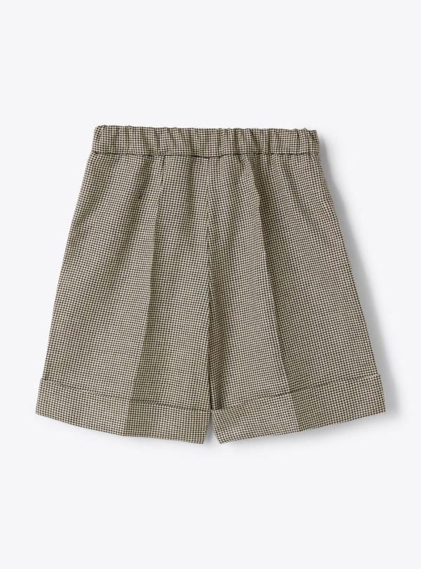 Flared bermuda shorts in houndstooth pattern interwoven with lurex thread. Features cuffed legs, front button and zip closure, and an elasticized waistband.
