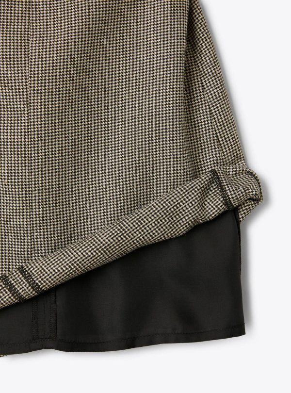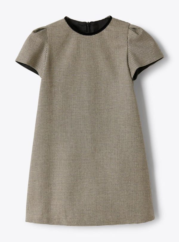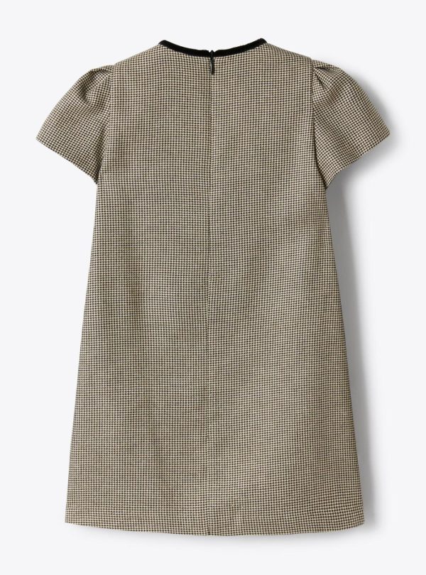 Trapeze dress with a straight line, inlaid with lurex-threaded houndstooth pattern and velvet-trimmed crew neck. Puff sleeves, concealed zipper at the back, and viscose blend lining.