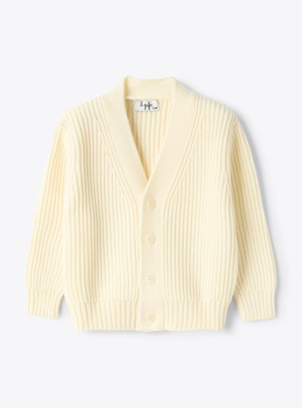 Organic cotton cardigan with English ribbed knit, V-neck, and front button closure.