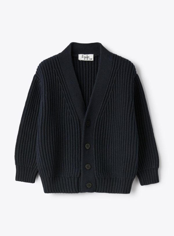 Organic cotton cardigan with English ribbed knit, V-neck, and front button closure.