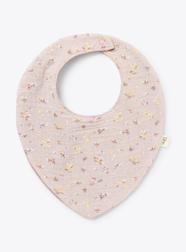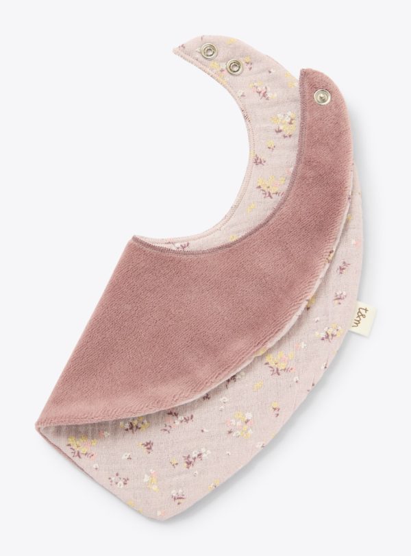 Organic cotton gauze and upcycled chenille bib with snap button closure and overlock stitching.