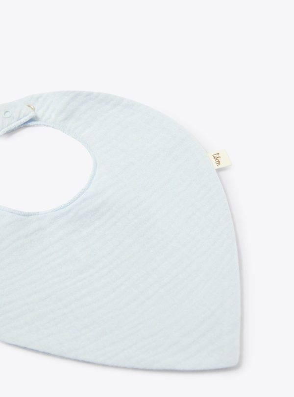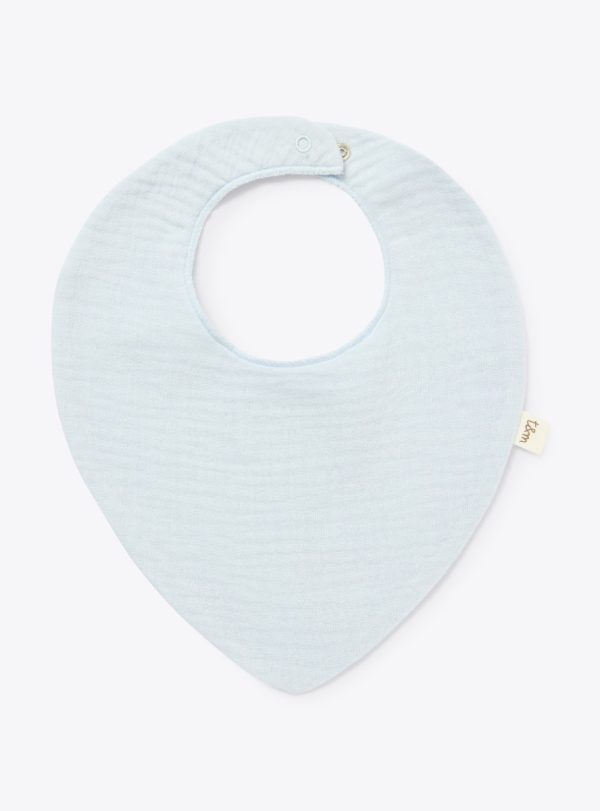 Organic cotton gauze bib with snap button closure and overlock stitching.