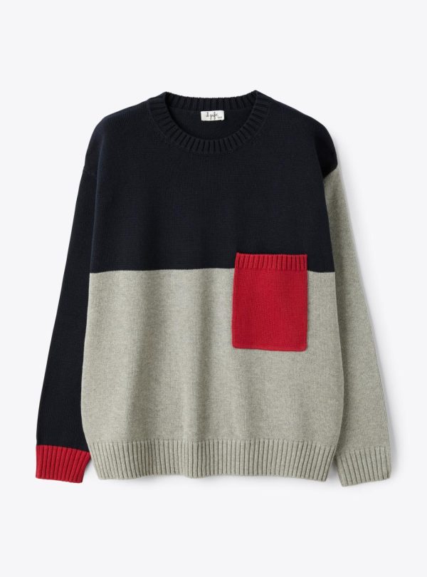Color-block crew neck sweater in organic cotton, featuring an applied pocket and ribbed finishes.
