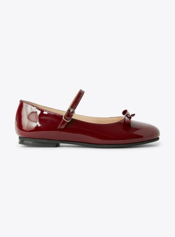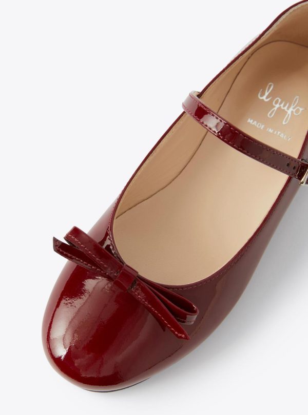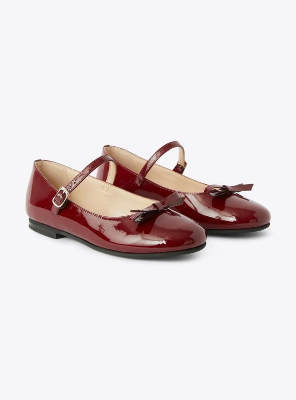 Ballet flats in patent leather with a bow, adjustable strap with buckle, and anti-slip rubber sole. Lined with leather.