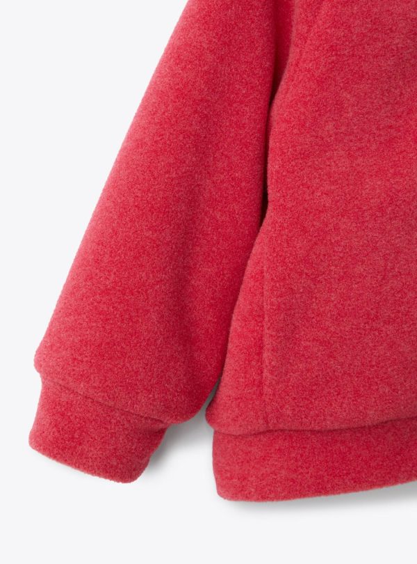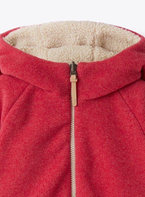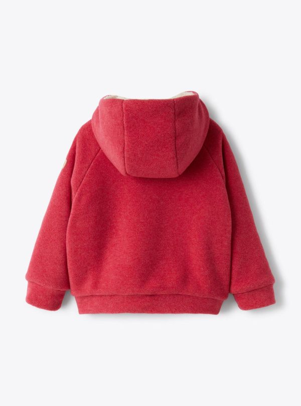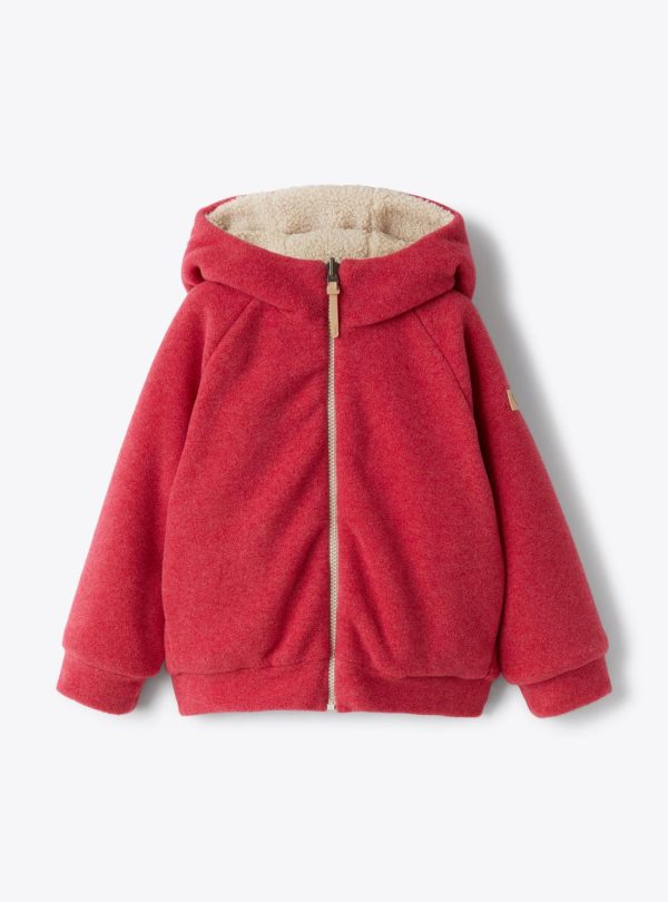Double-faced jacket with hood made of fleece and curly fabric. Full zip opening with silicone puller and side slit pockets.