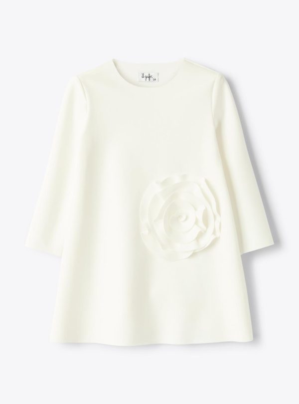 Flared dress in Sensitive® Fabrics with a large applied flower and raw edge trim.