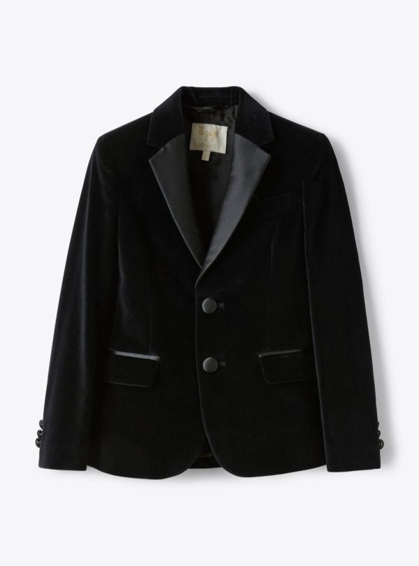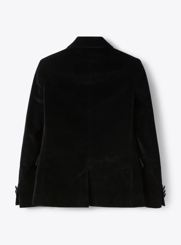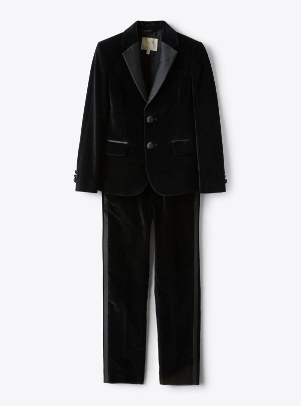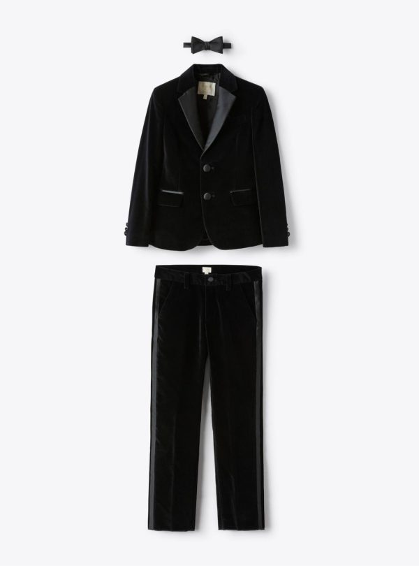Smooth cotton velvet tuxedo with satin inserts. Regular fit jacket with shawl lapels, front opening with two buttons, and side pockets. Buttons on the cuffs and central slit at the back. Straight leg pants with side stripe detail, front opening with button and zip. Slant pockets and welt pocket with button at the back. Internal elastic for fit adjustment. Satin bow tie, closure with velcro.