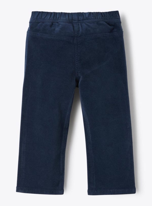 Trousers made from smooth stretch cotton velvet with an elastic waistband, faux zipper, and faux pockets.