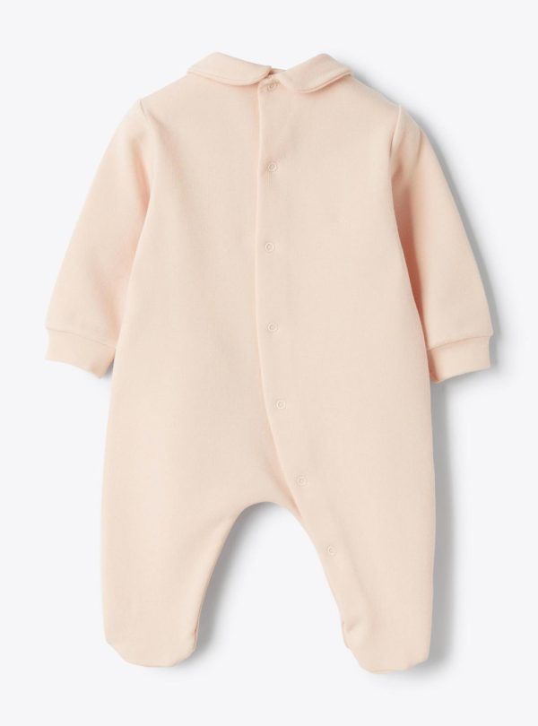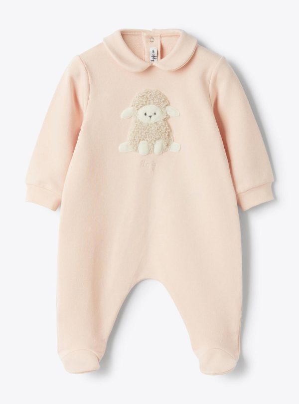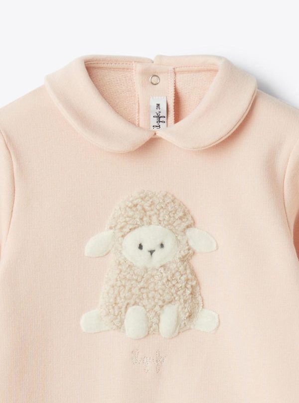 Stretch cotton fleece jumpsuit with a round collar and curly fabric and fleece sheep appliqué. Snap button closure at the back.