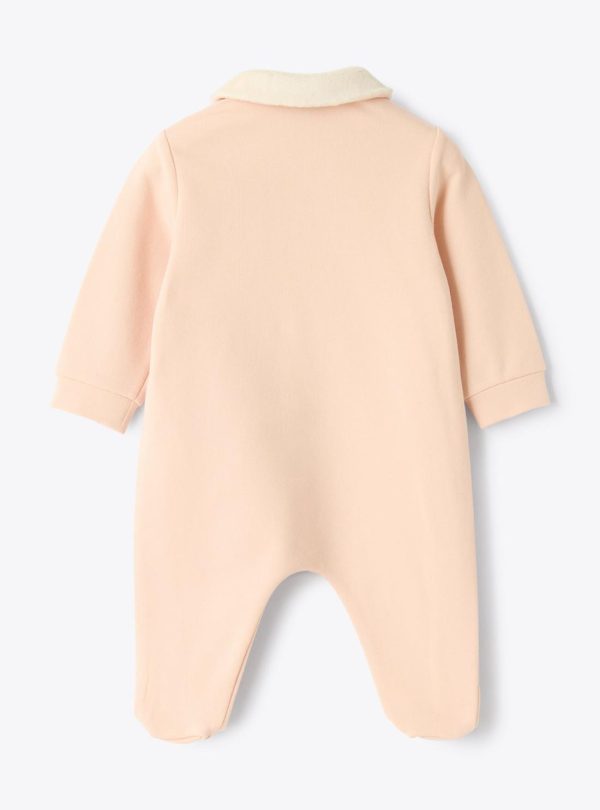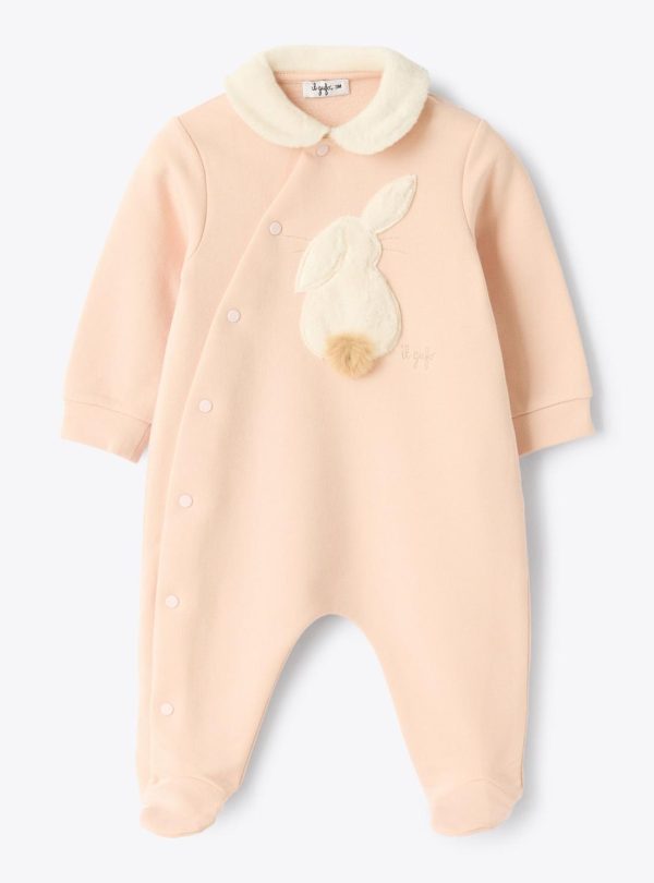 Stretch cotton fleece jumpsuit with a round collar and bunny appliqué in eco-fur with embroidered detail. Front snap button closure.