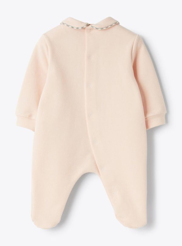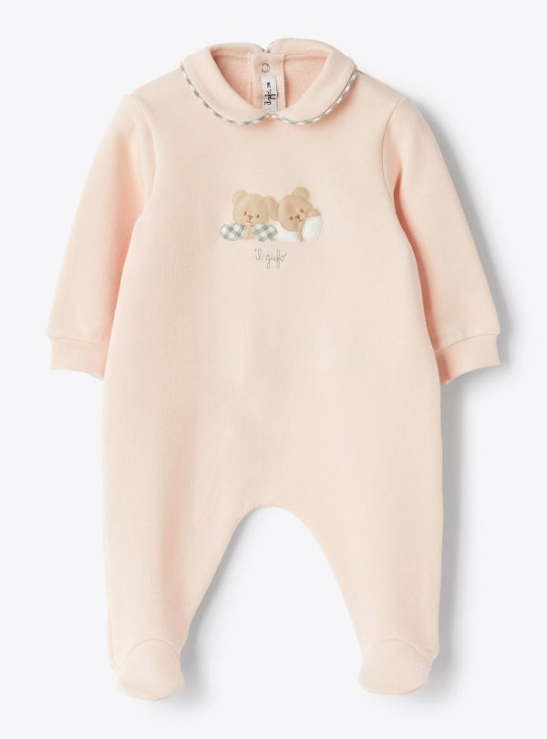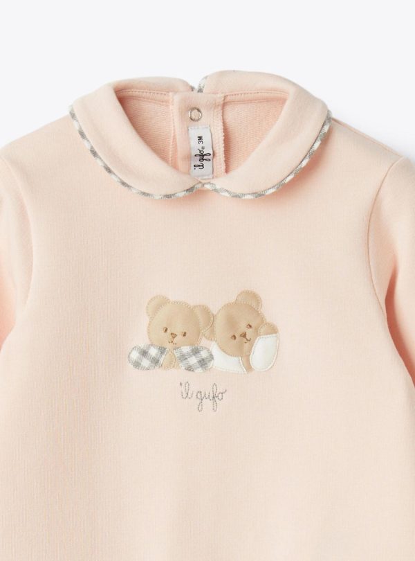 Stretch cotton fleece jumpsuit with a round collar trimmed in checkered flannel. Bear appliqués on the front and snap button closure at the back.