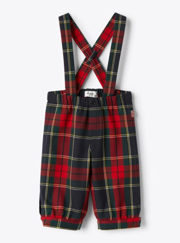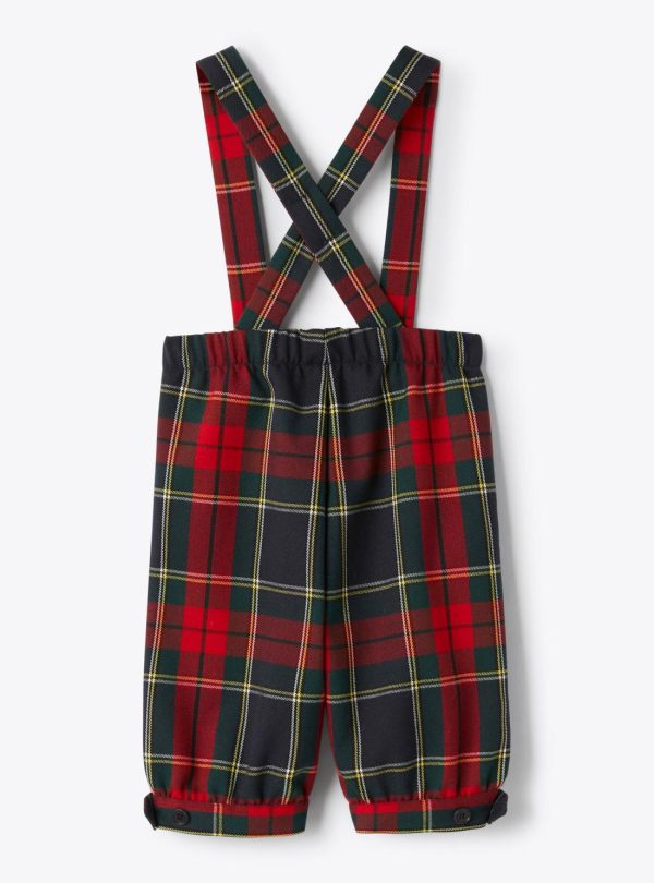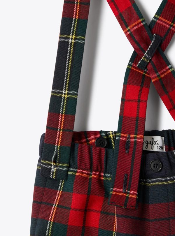 Tartan techno-wool overall with elastic waistband, faux button and fake zipper. Adjustable suspenders with double loops at the back and opening buttons at the bottom.