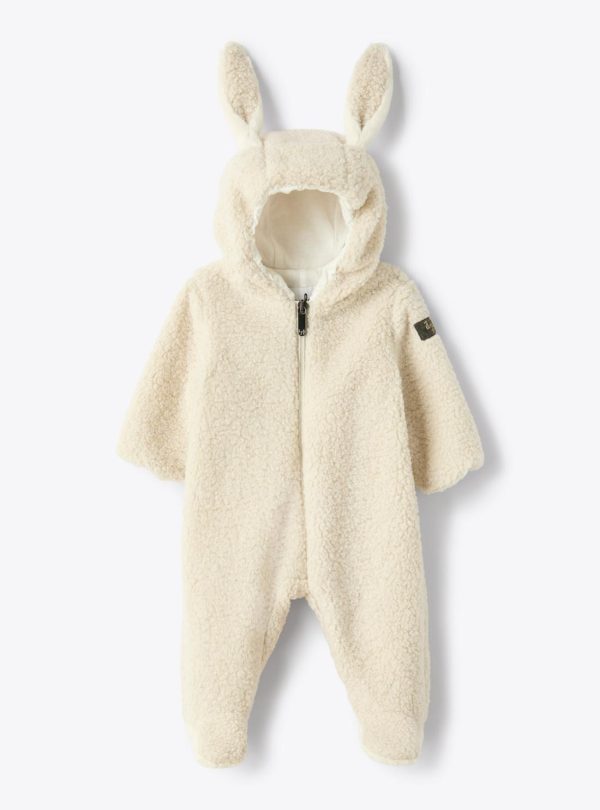 Teddy jumpsuit with front full zip. Hood with ears and tail at the back, made of faux fur. Inner lining in 100% cotton jersey.