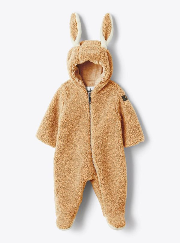 Teddy jumpsuit with front full zip. Hood with ears and tail at the back, made of faux fur. Inner lining in 100% cotton jersey.