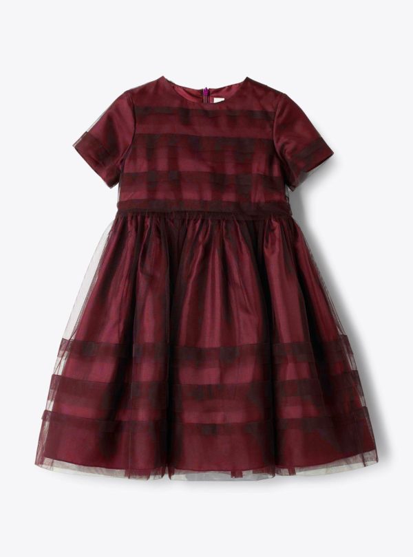 Tulle dress with horizontal laser-cut detailing, featuring a maxi skirt with a tulle flounce and internal lining. Concealed zipper at the back.