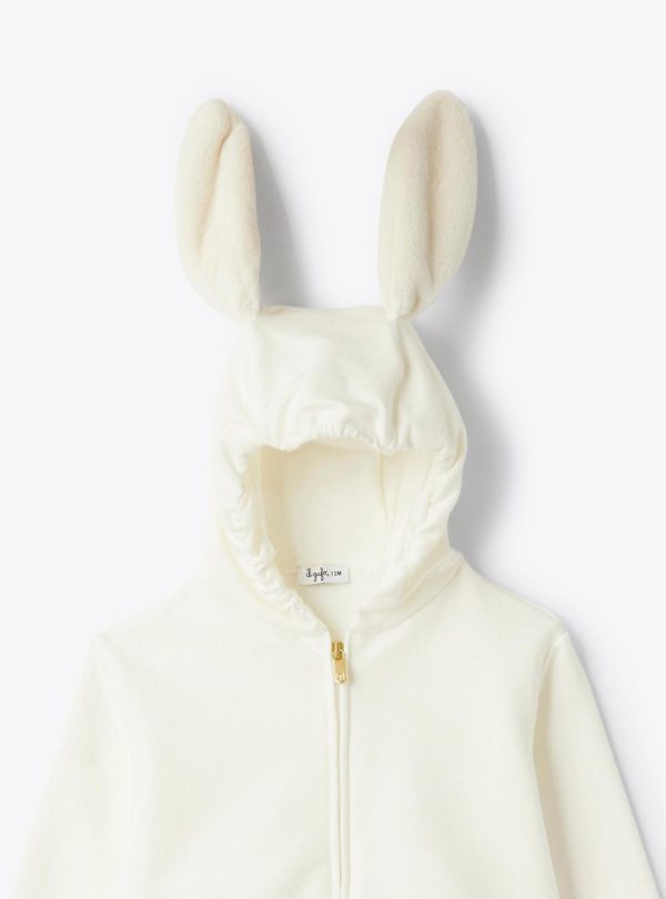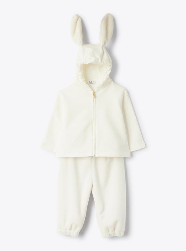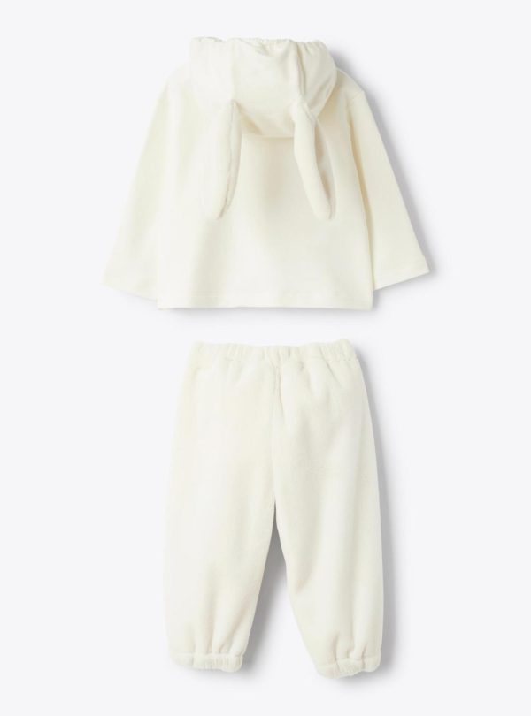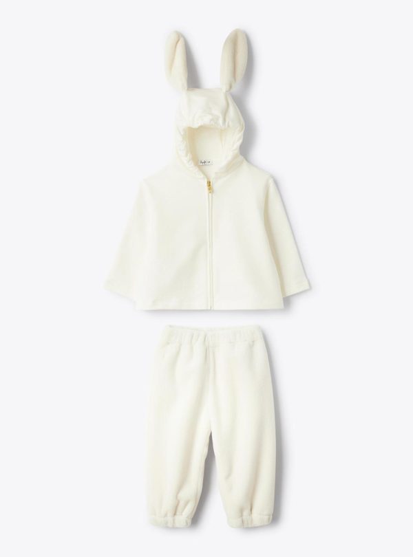 Cotton fleece set consisting of zip-up hoodie with front full zip, elastic hood with eco-fur applied ears and jogger pants with elastic waistband and cuffs.