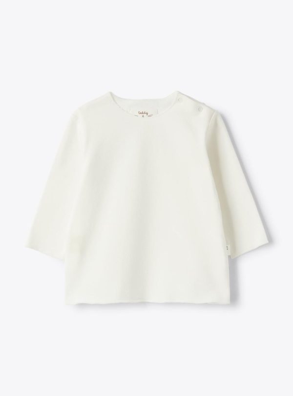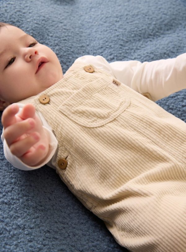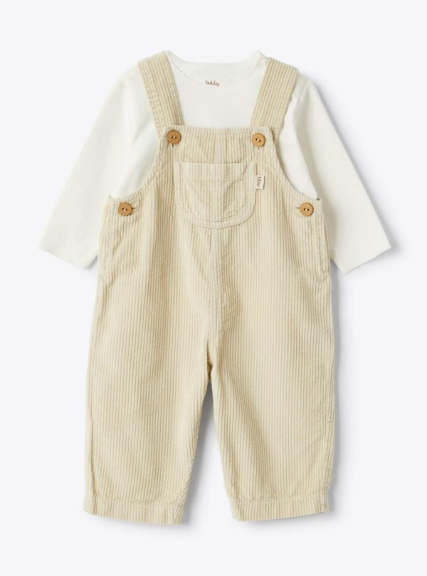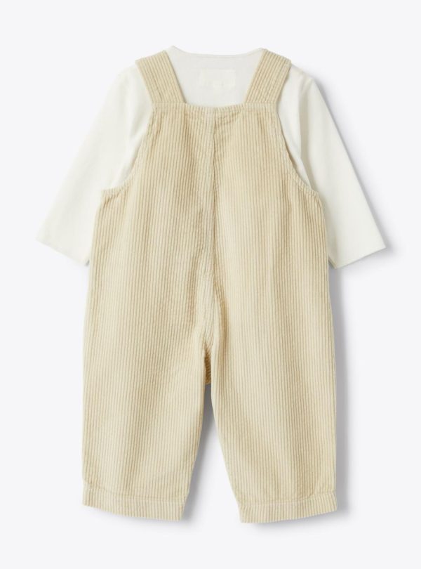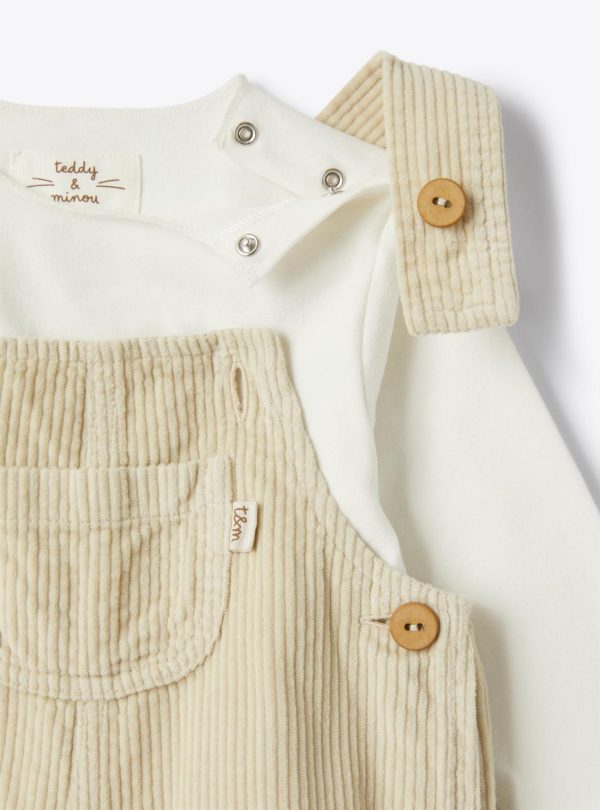 Two-piece set in organic cotton jersey and upcycled cotton corduroy. Long-sleeved T-shirt with snap buttons on the shoulder. Overalls with cotton button closure and front kangaroo pocket.