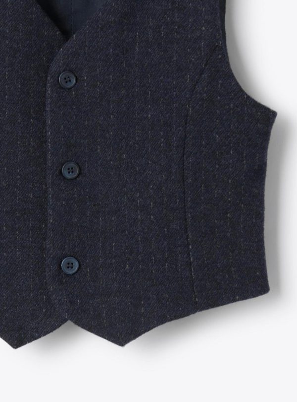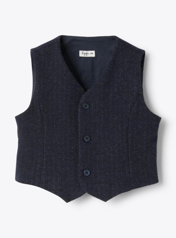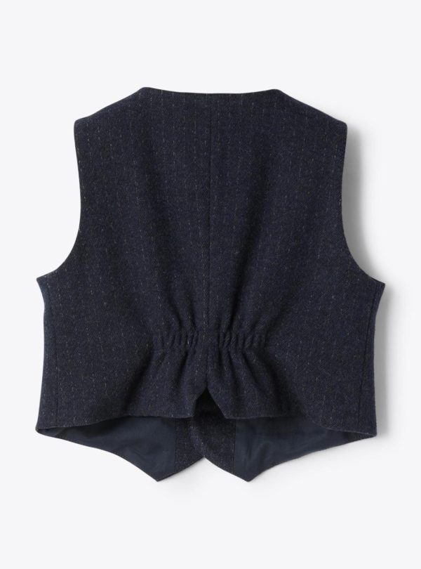 Vest in sweat fabric with pinstripe pattern. Front button closure, faux welt pockets, and elastic gathering at the back.