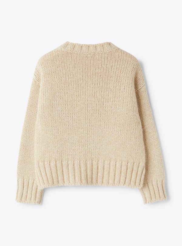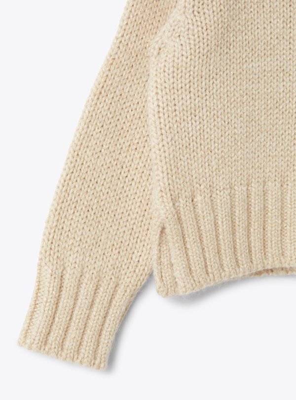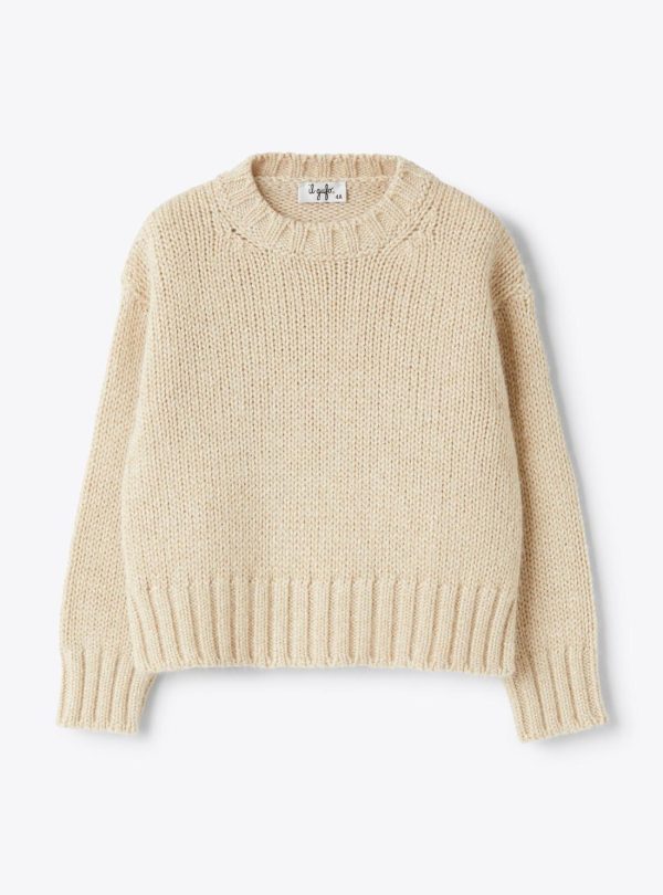 Crew neck sweater made of a viscose and golden lurex blend yarn. Side slits and ribbed finishes.