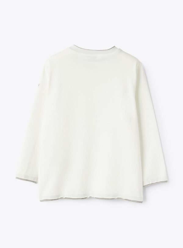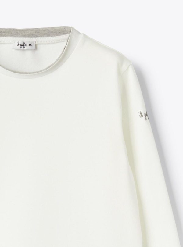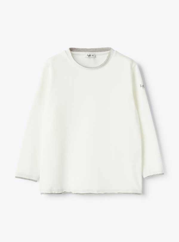 Milk white long sleeve T-shirt in brushed stretch jersey with raw-cut trims in contrast grey. A regular-fit basic piece to style with any kind of outfit.
