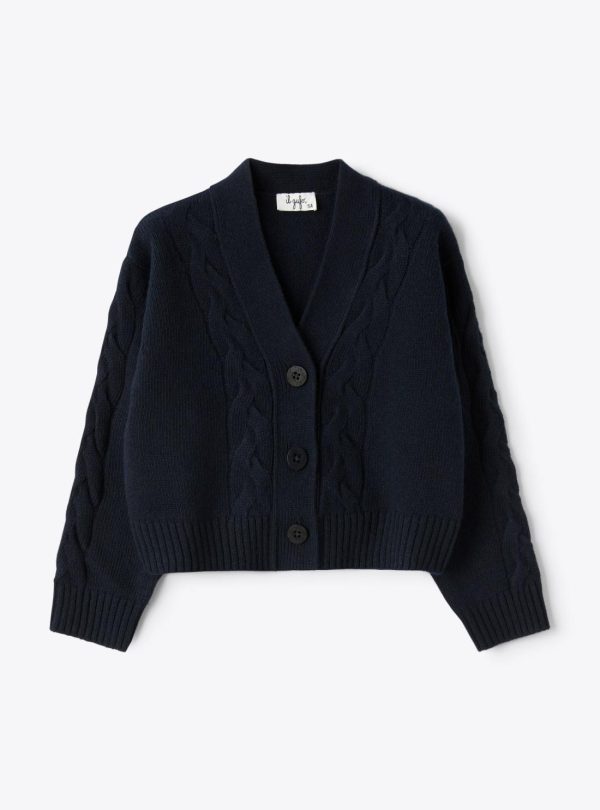 Extra fine merino wool cardigan with a V-neck, single cable knit on the edges and sleeves. Front button closure and ribbed finishes.