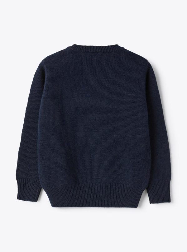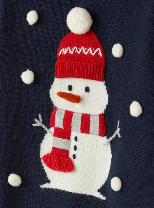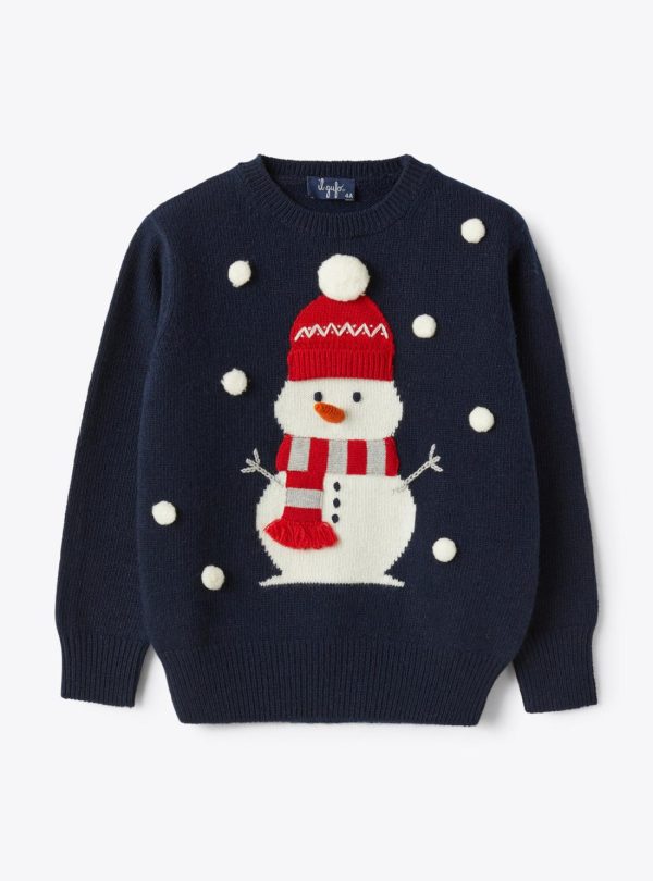 Crew neck sweater made of extra fine merino wool with a snowman. Crochet appliqués and hand-embroidered details. Ribbed finishes.