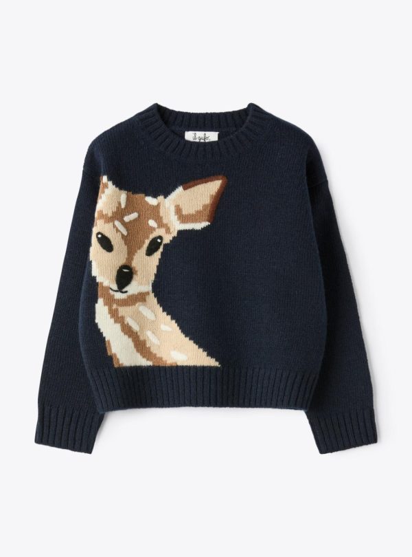 Round-neck sweater in extra fine merino wool with inlaid fawn and hand-embroidered details. Ribbed finishes.