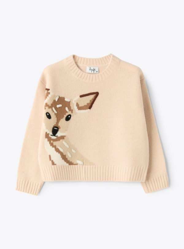 Round-neck sweater in extra fine merino wool with inlaid fawn and hand-embroidered details. Ribbed finishes.